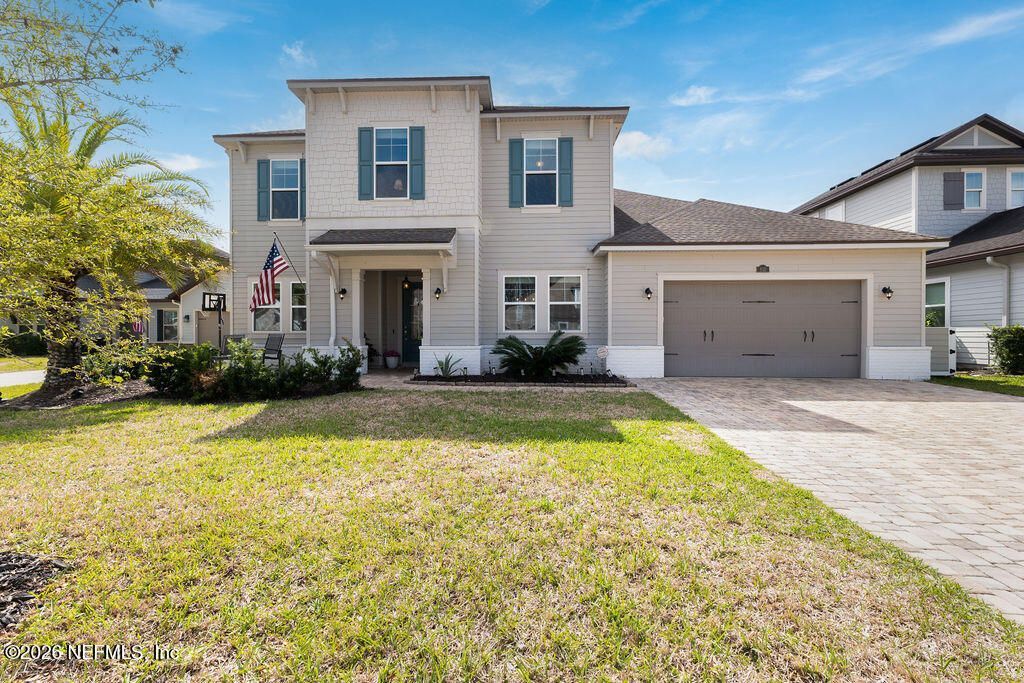 Welcome to The Outlook in Twenty Mile! This 2 story, 4 bed, 4 bath home built in 2017 is located on a quiet cul-de-sac. Lowest priced per sq/ft pool home with rare lake to preserve views. You will not find a better location in Nocatee. Private resort style lanai w/beautifully tiled salt pool and spa, palm trees, lush green fenced in yard is great for pets and children. On the ground floor you will find a junior suite separate from the main living area with lake views and full en suite bathroom. A 2nd full cabana bath off the kitchen, large office/flex space, dining room, walk in butler's pantry, eat in kitchen, and laundry room with drop zone. Retreat to your quiet second floor primary suite with unobstructed views of the preserve, a gorgeous expansive bathroom complete with soaker tub and frameless shower as well as two walk in closets. A loft space, 2 more spacious bedrooms and the 4th full bathroom w/ double vanity. Electric panel wired for EV and generator. Don't let this one pass